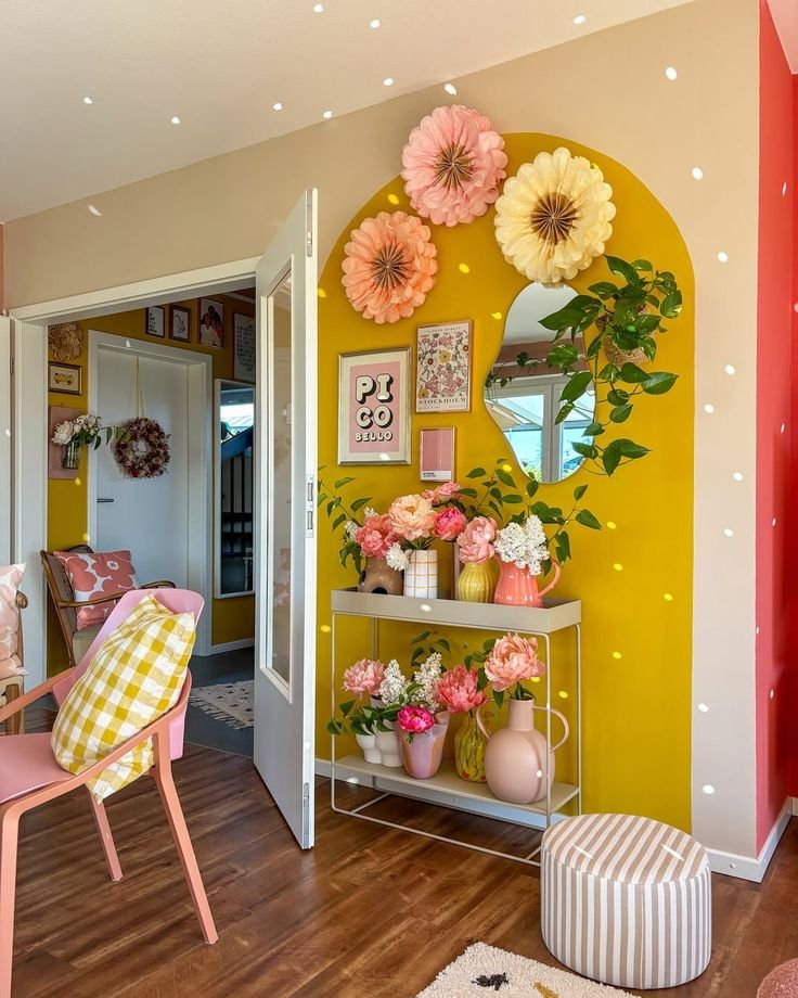 These warm tones often spark conversation, creating a lively and fun atmosphere that’s perfect for social spaces, just like this beautifully decorated area with vibrant flowers!